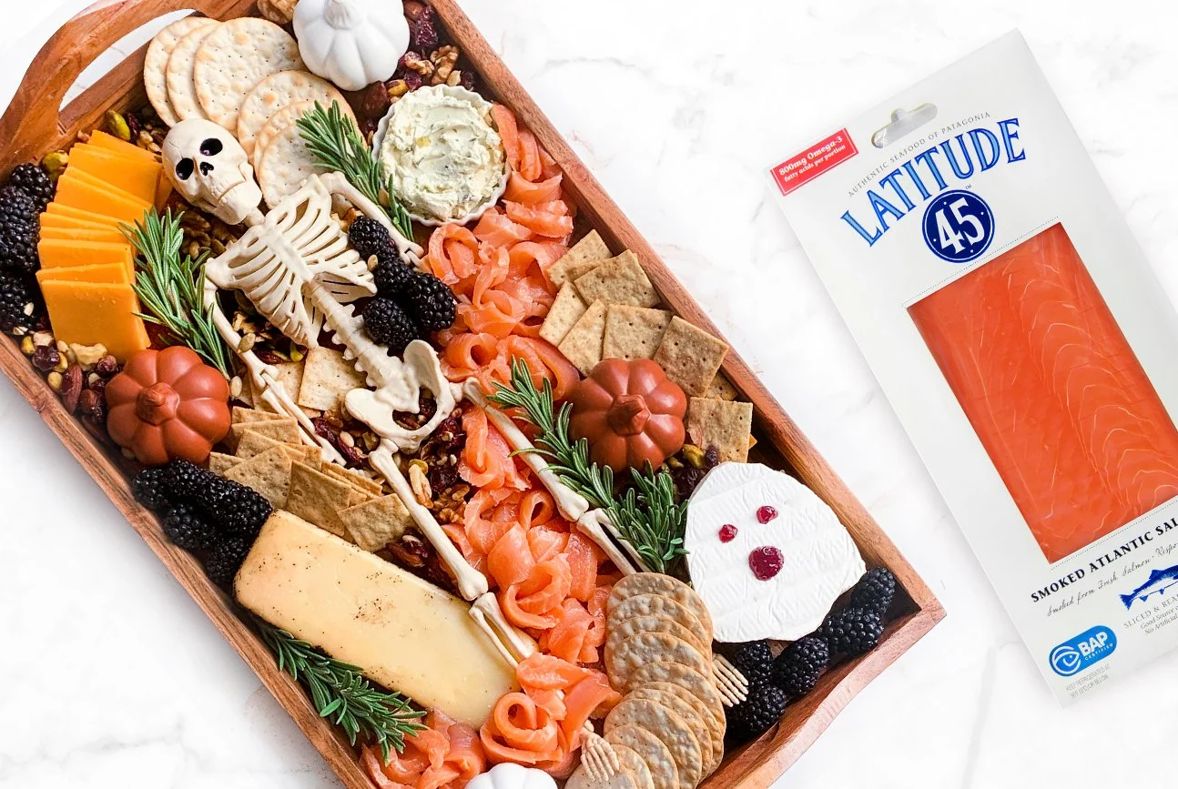 Next, arrange your Latitude 45 smoked salmon across board.